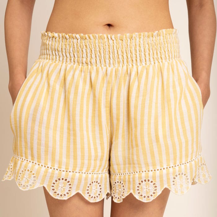 It features stripe prints and has a high-waisted silhouette with schiffli eyelet and scalloped hem, romantic ladder-lace inserts, and functional pockets to keep your small essentials (phone, lip balm, etc.) handy.