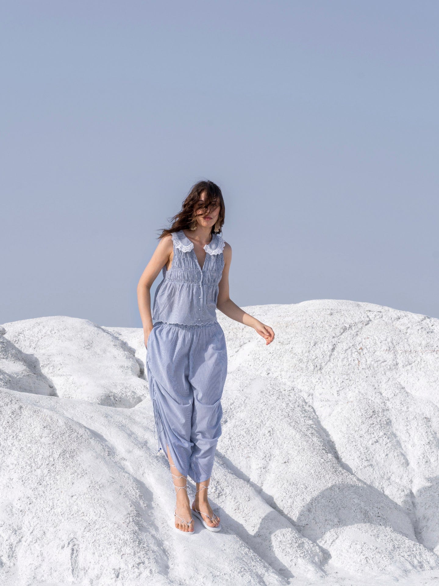 Functional side drawstring at legs with shell and glass bead accents, relaxed wide-leg silhouette, and smocked waistband.