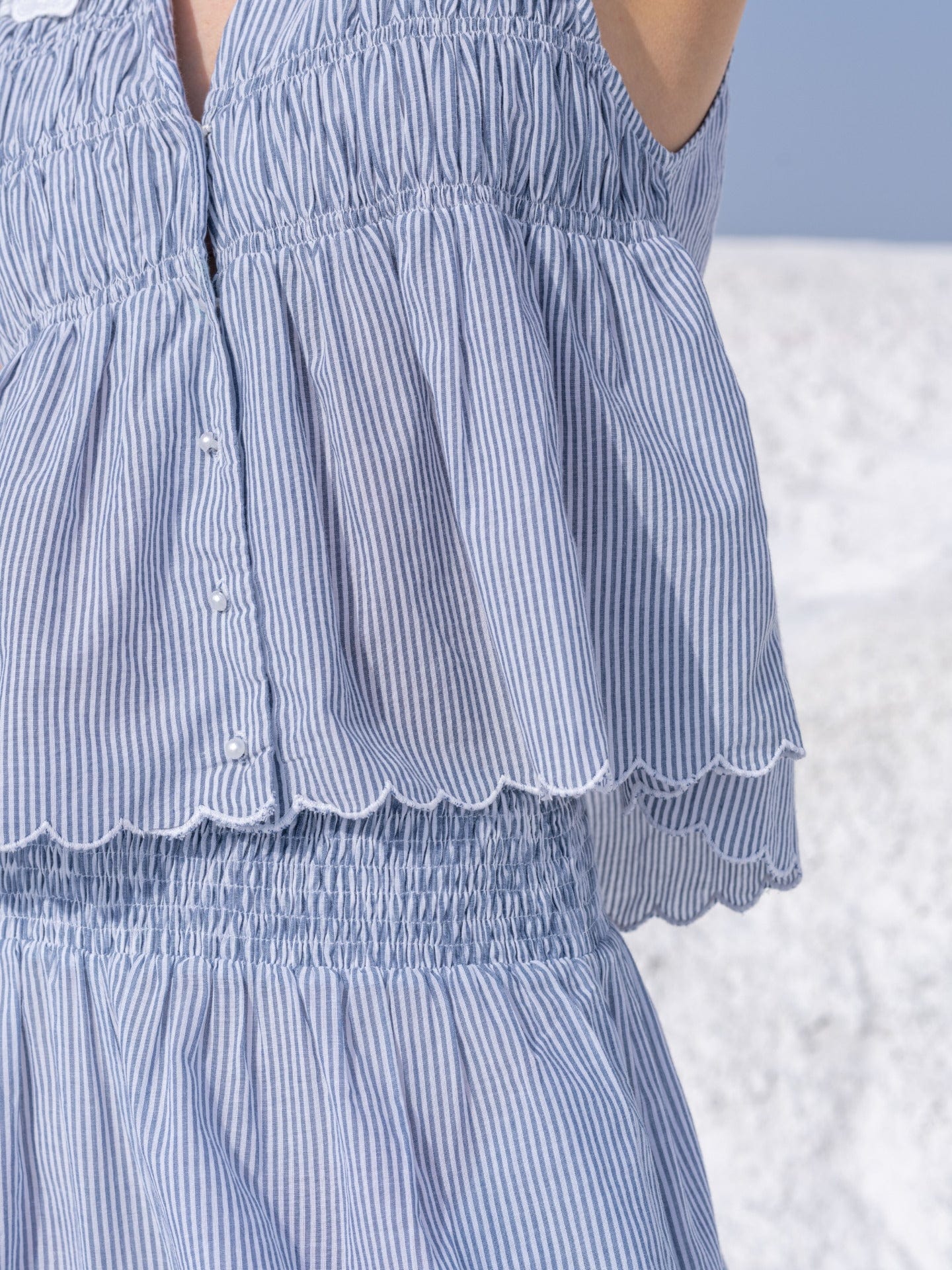Soft sky-blue and white stripes with a delicate cord edge stopper for a resort-ready feel.