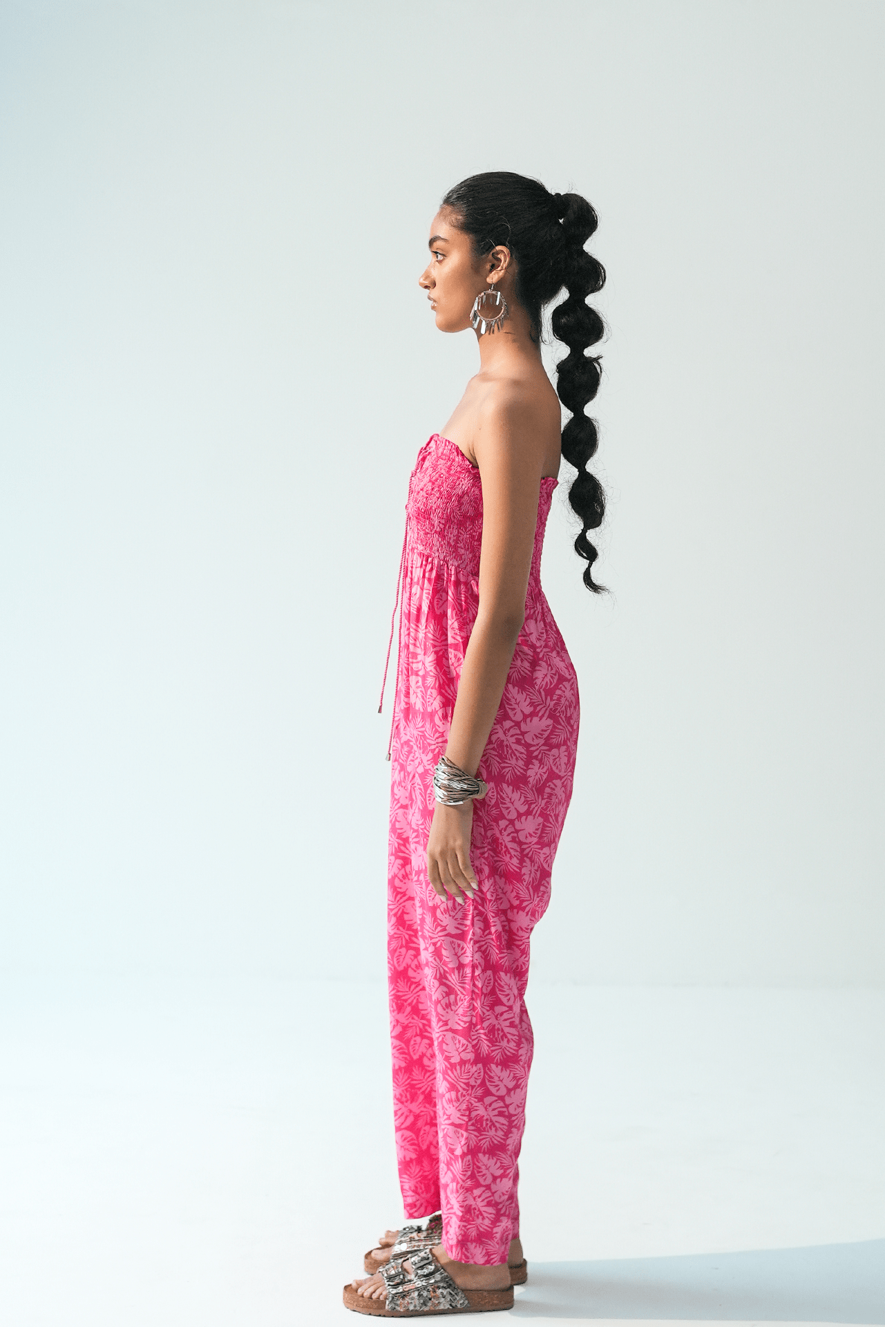 The jumpsuit comes with a vibrant digital print that gives it a getaway ready, effortless charm. It also has side pockets for practicality.