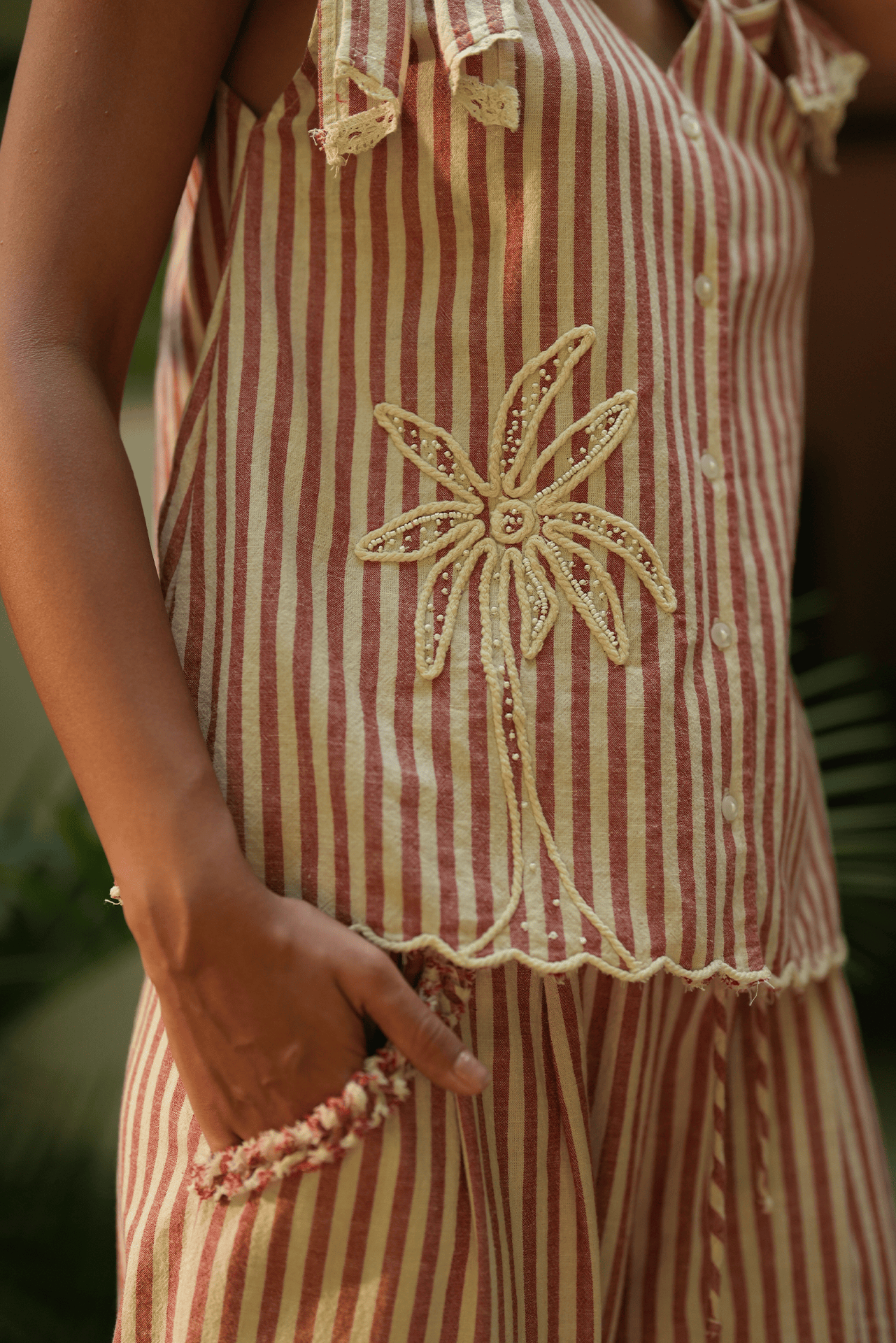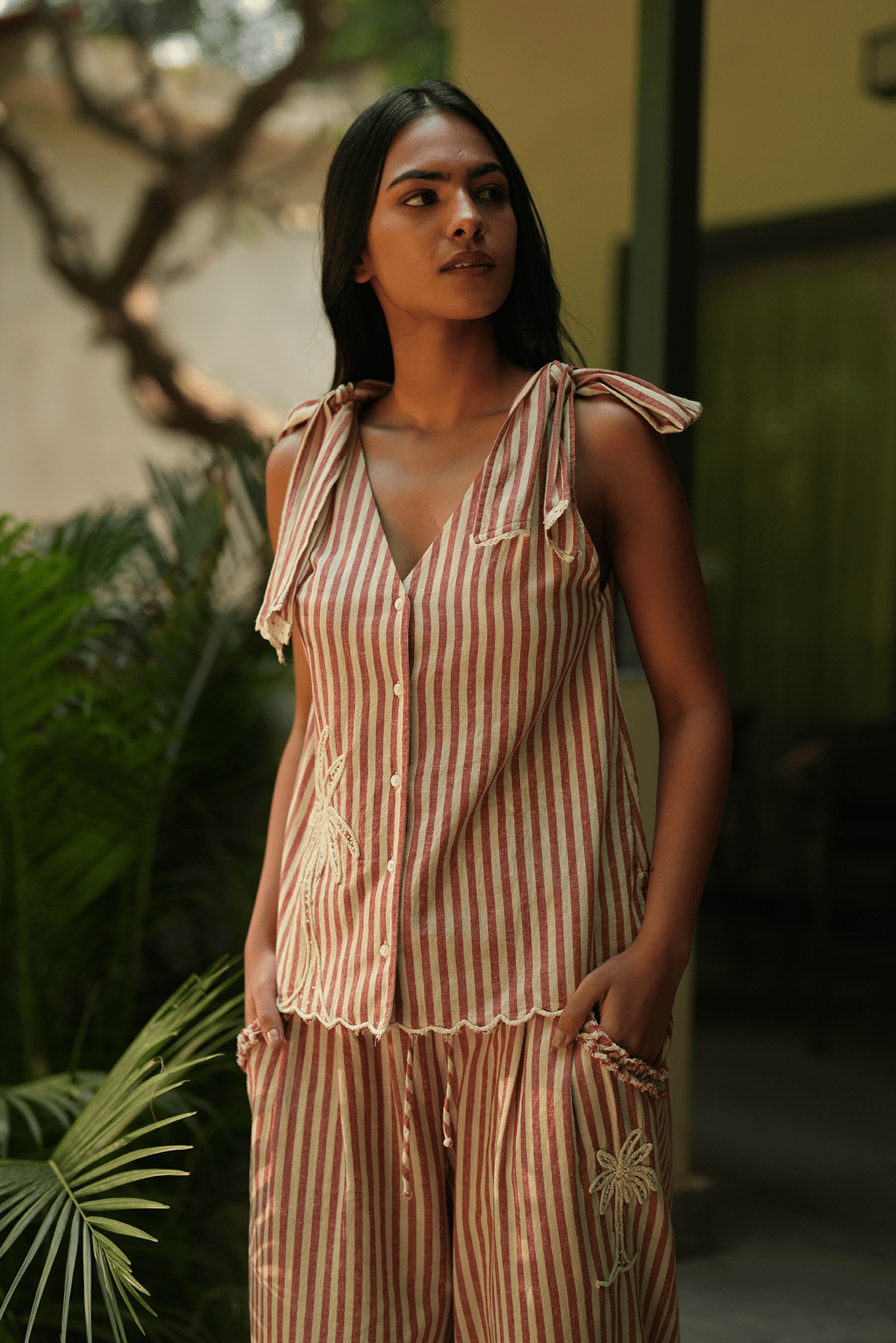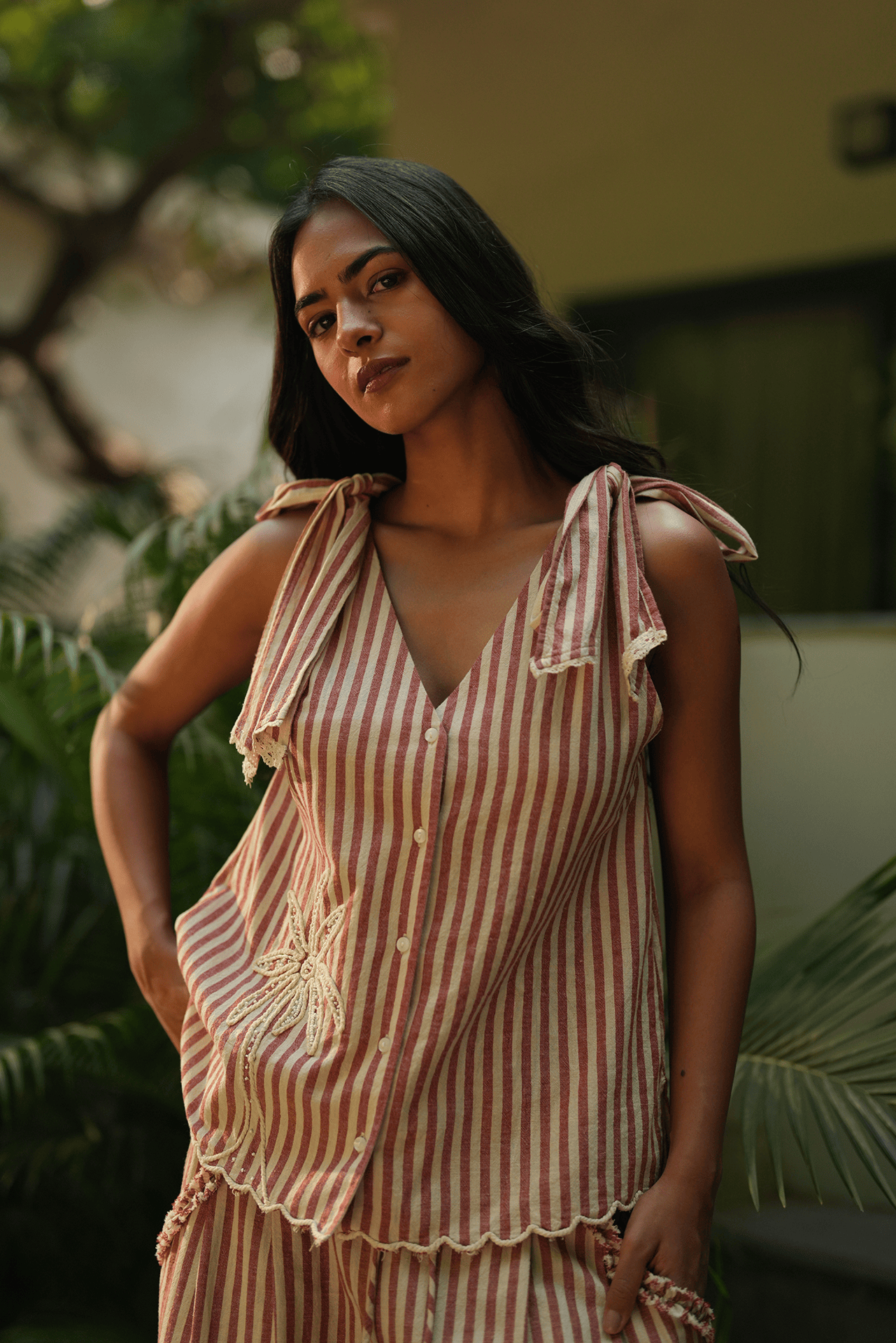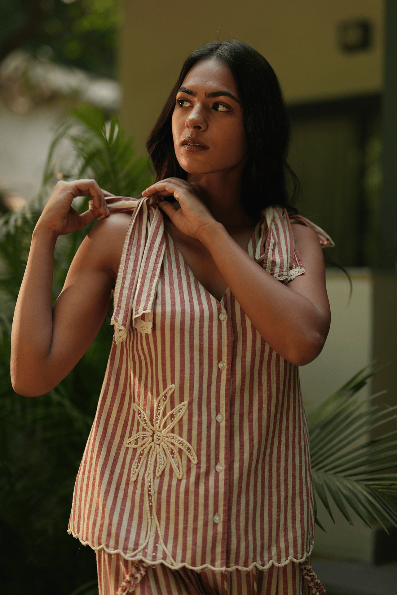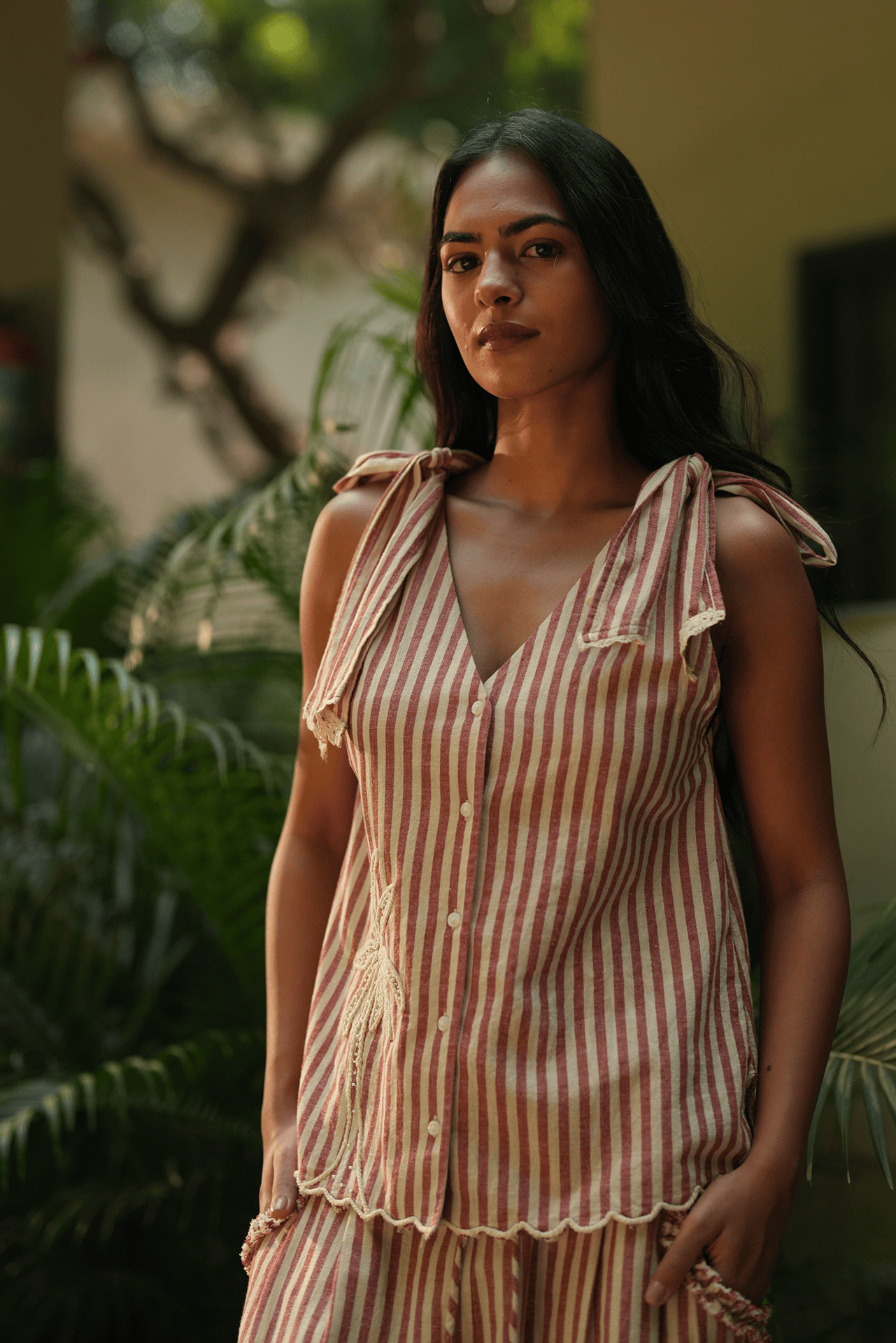 RAISIN TOP-The raisin top a yarn dyed striped tie knot top with lace edges cord ,scalloped hem with touches of pearls palm motifs in a tiny power power house of style.