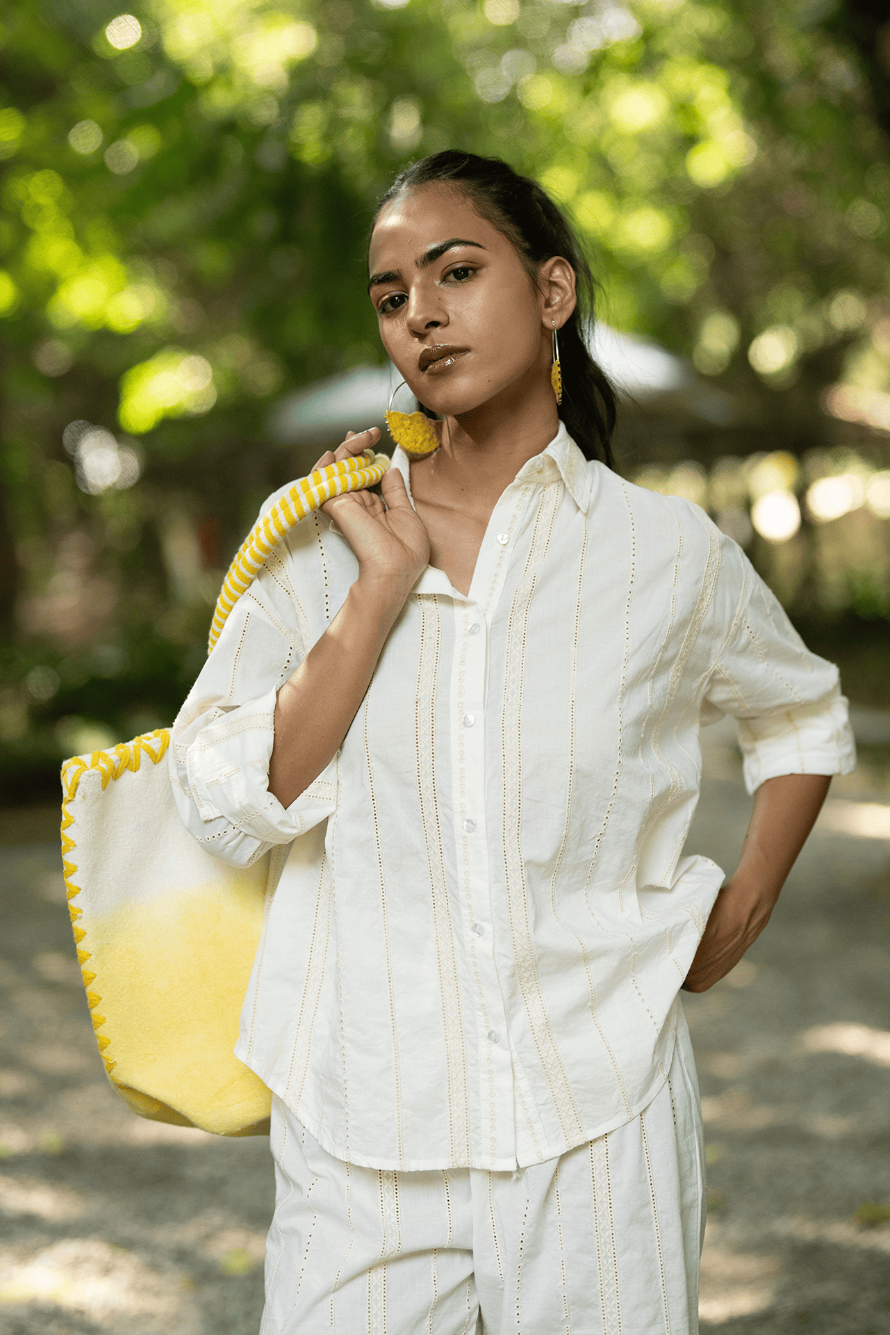 CREAME SWEET CORN SHIRT- Sunkissed and softly struched crafted in cambric cotton with delicate schiffli embroidery for a high any feel.botton down collared shirt ,rounded hem endless effortless charm